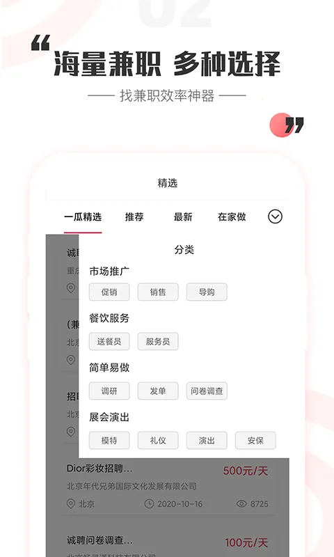 2. 软件可根据位置、兼职类型等搜索,操作简单。严格筛选签到公司,保障求职者安全,在线工作丰富。