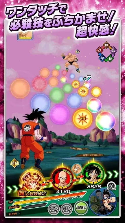 独特战斗玩法 全新的动作益智游戏类型,点击并链接气之球进行攻击,进入Dokkan模式来击败敌人。收集足够气球激活超级攻击,像动漫中一样体验悟空的卡美哈美哈、贝吉塔的最终闪光等经典技能,享受战斗乐趣。